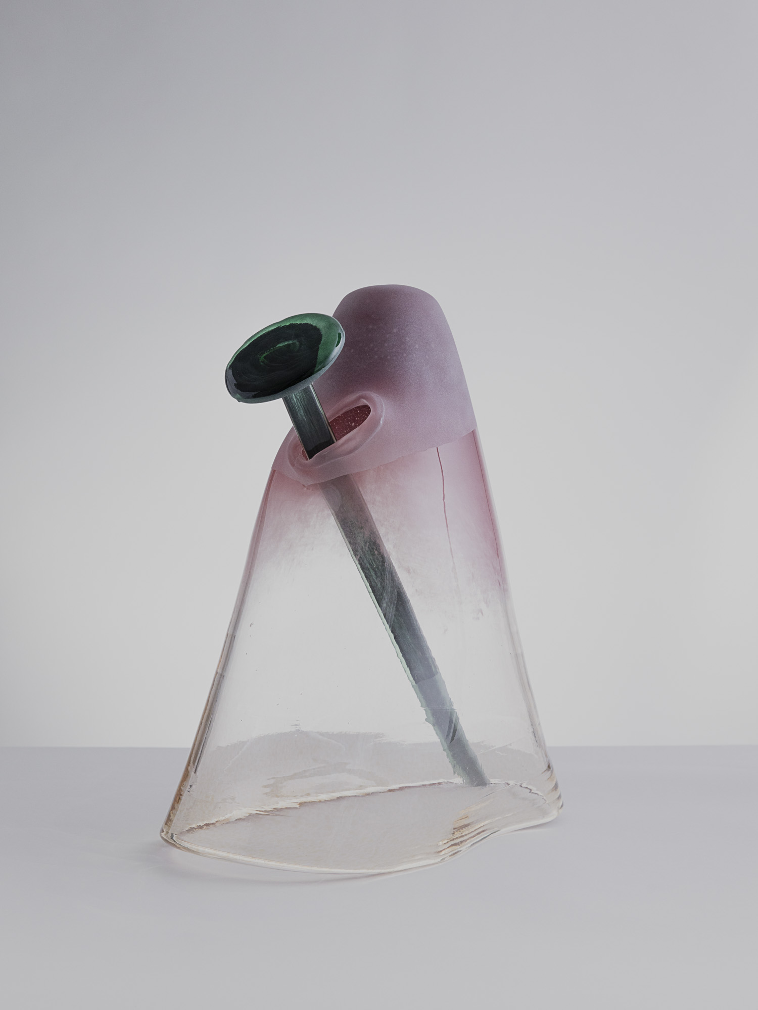 The former applies to Fix the final episode in the healing process, and culminates in the gesture of fixing a nail, a metaphor for ideas. The nail pierces the body of glass, which transcends the rigidity of the material and presents organic lines which crystallize, or fix, into a containing and protective vessel, a proxy of the human experience. Through the use of soft and warm, almost living, forms Matete soaks the objects in autobiographical references, starting from her relationship with his parents, as well as being charged with eroticism, sensuality, and poetry.